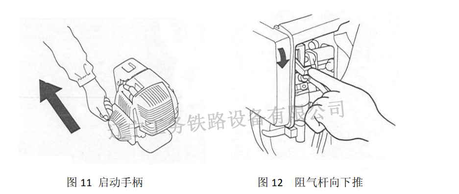 在輕輕拉啟動手柄,直到感到有阻力時再用力拉,如汽油機長時間未使用,應連續(xù)拉動啟動手柄幾次使汽油進入油路系統(tǒng),汽油機即可發(fā)動(見圖 11);