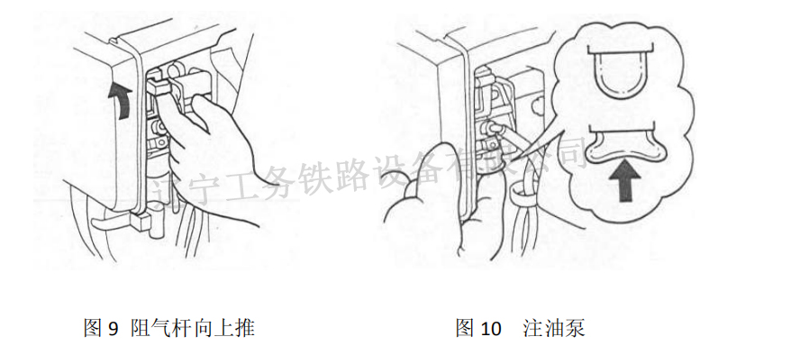 首先將汽油機的啟動開關撥至“ON”位置(處于汽油機右側);然后把阻氣桿移至關閉位置(見圖 9),氣門處于關閉位置,按注油泵數(shù)次直到汽油回管中可以明顯地看到油流時為止(見圖 10)